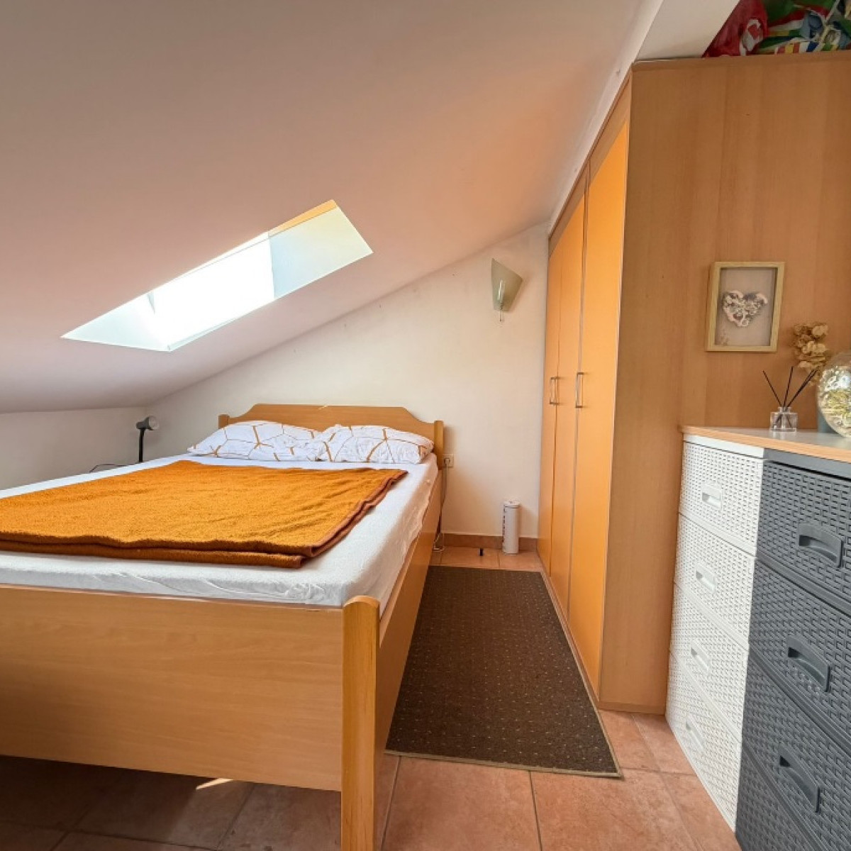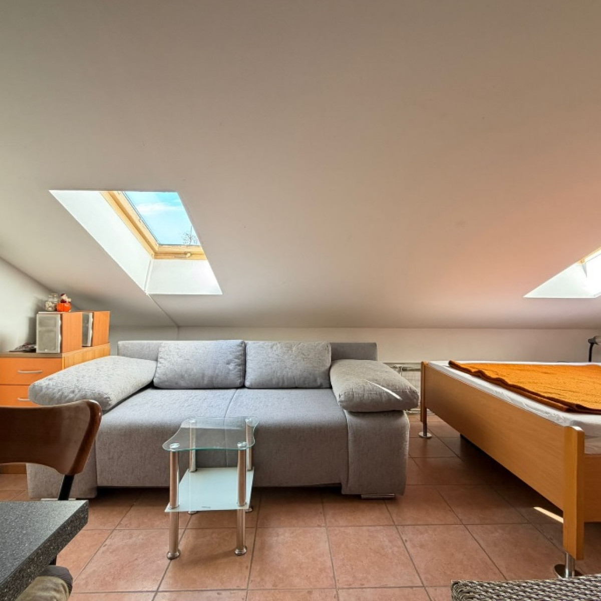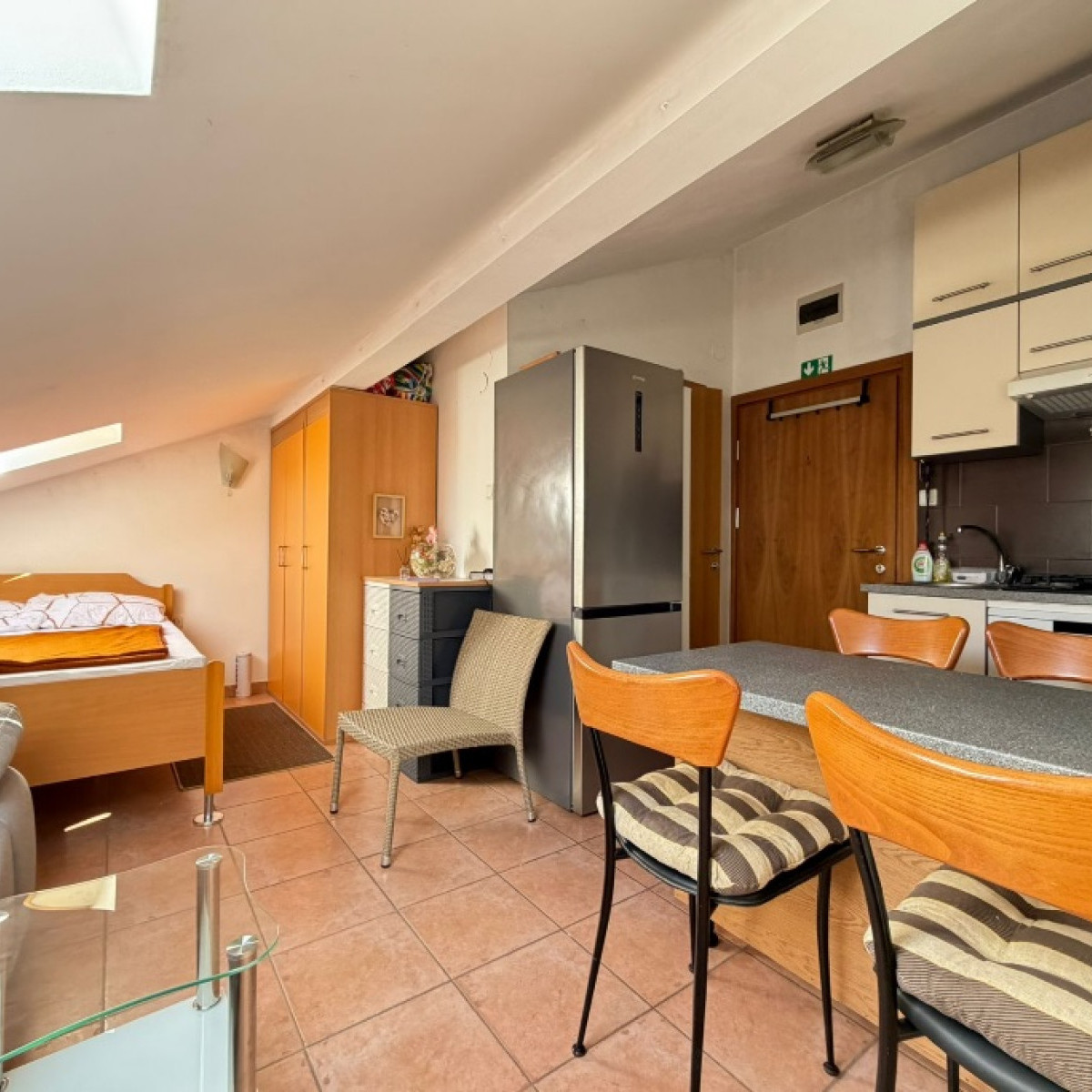 Do apartamentu na poddaszu prowadzą schody w budynku. Ze względu na nachylenie terenu, jego powierzchnia obliczeniowa wynosi 8,46 m², a rzeczywista około 25 m².