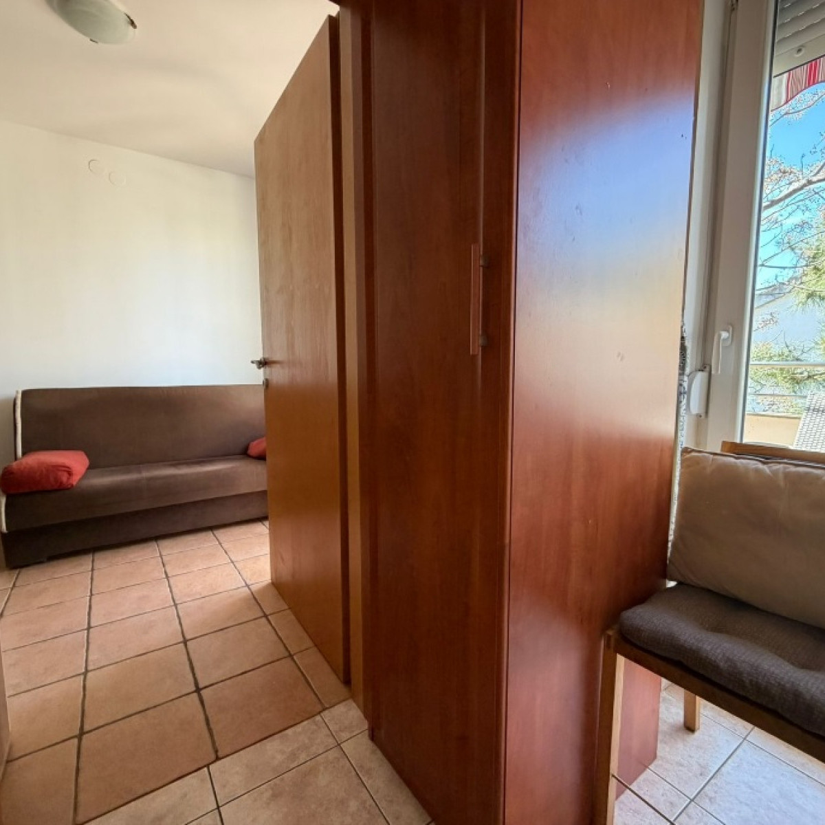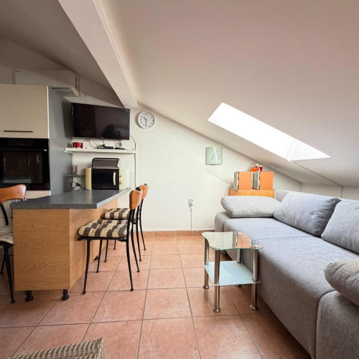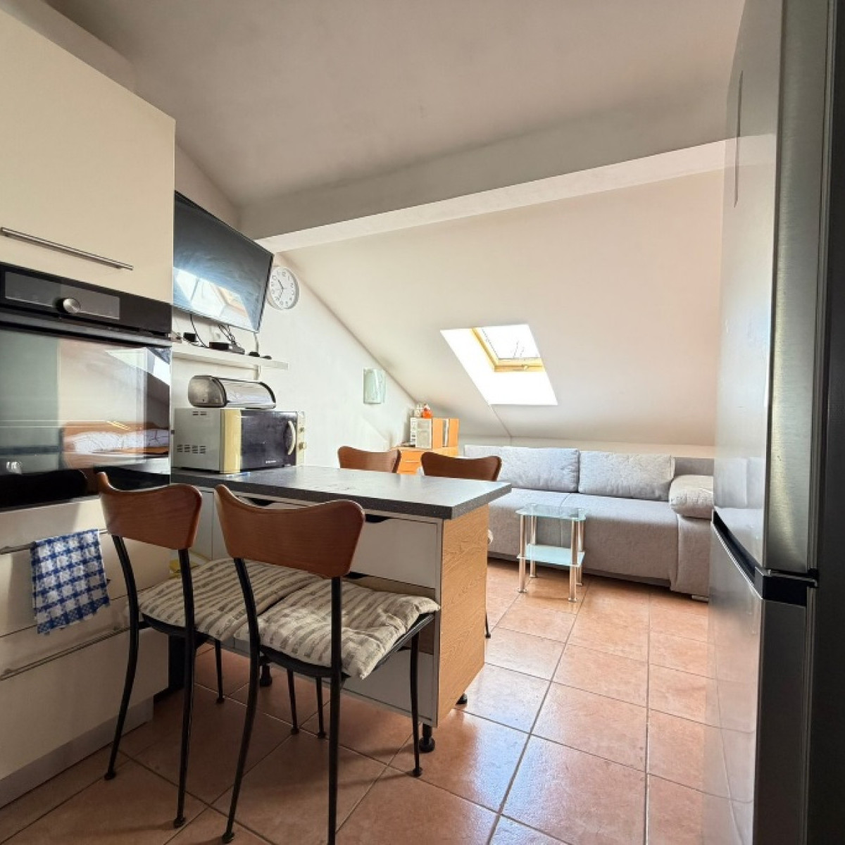 Do apartamentu na poddaszu prowadzą schody w budynku. Ze względu na nachylenie terenu, jego powierzchnia obliczeniowa wynosi 8,46 m², a rzeczywista około 25 m².