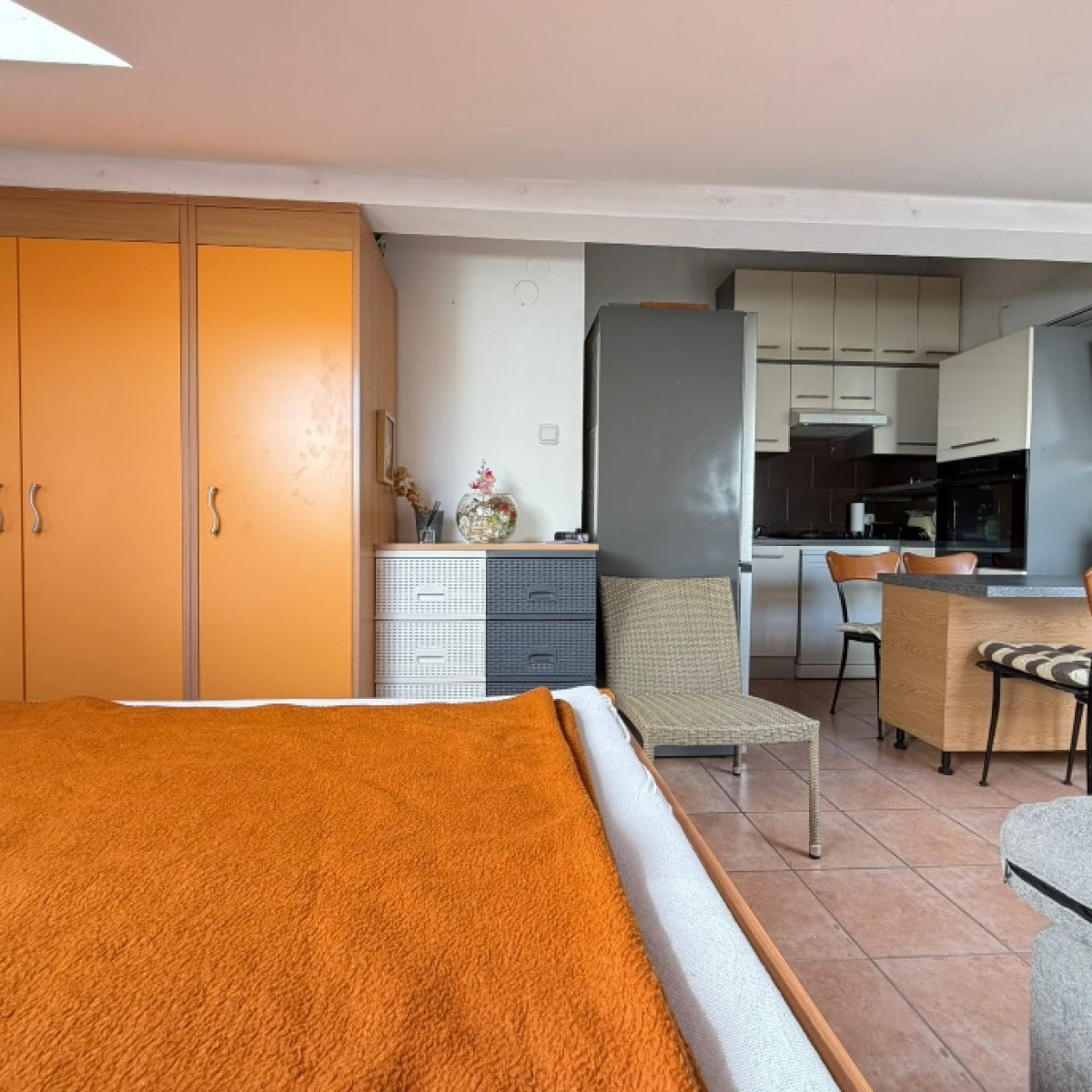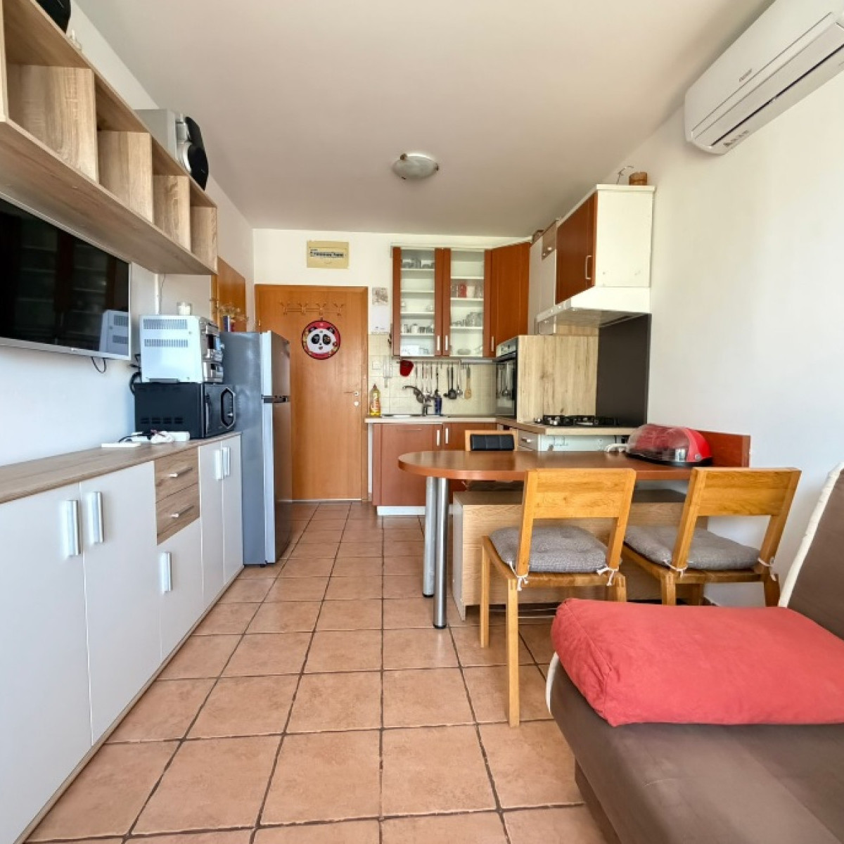 Jest to apartament typu studio składający się z pokoju głównego z kuchnią z jadalnią, sofą i łóżkiem oraz łazienki.
