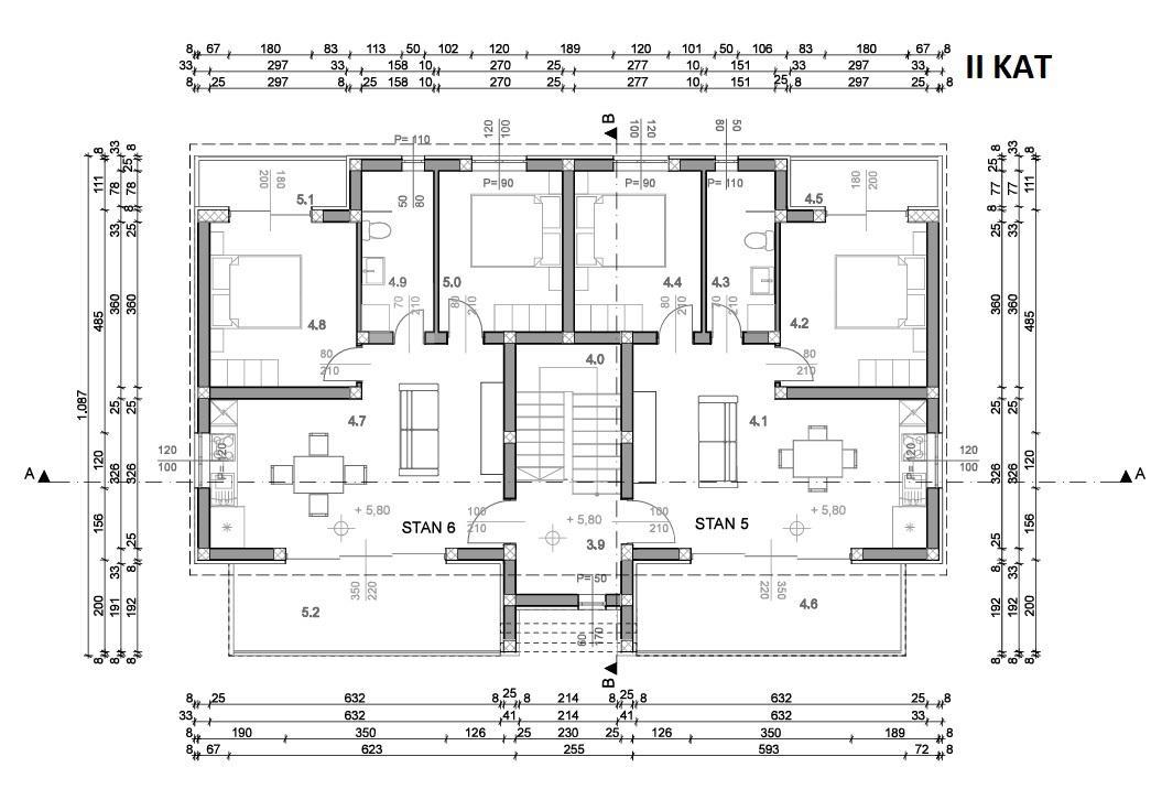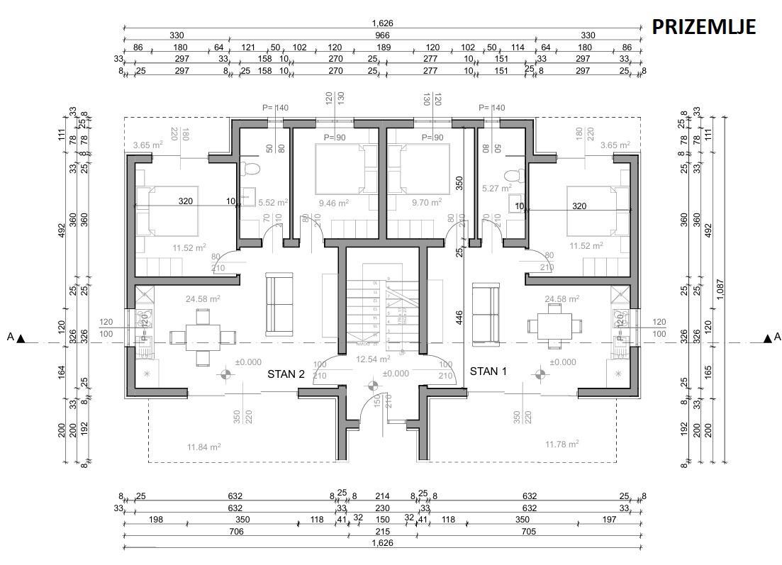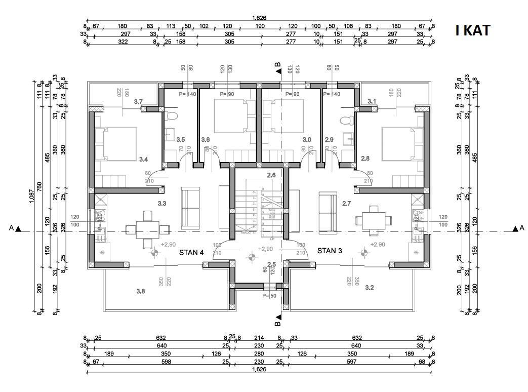 Każdy apartament składa się z przestronnego salonu z kuchnią, dwóch sypialni, łazienki, przedpokoju, dużego zadaszonego tarasu z pięknym widokiem na morze i mniejszego tarasu od strony sypialni z widokiem na centrum Povljany.